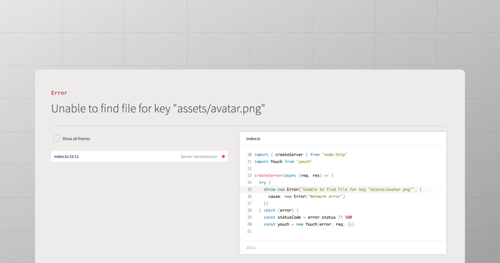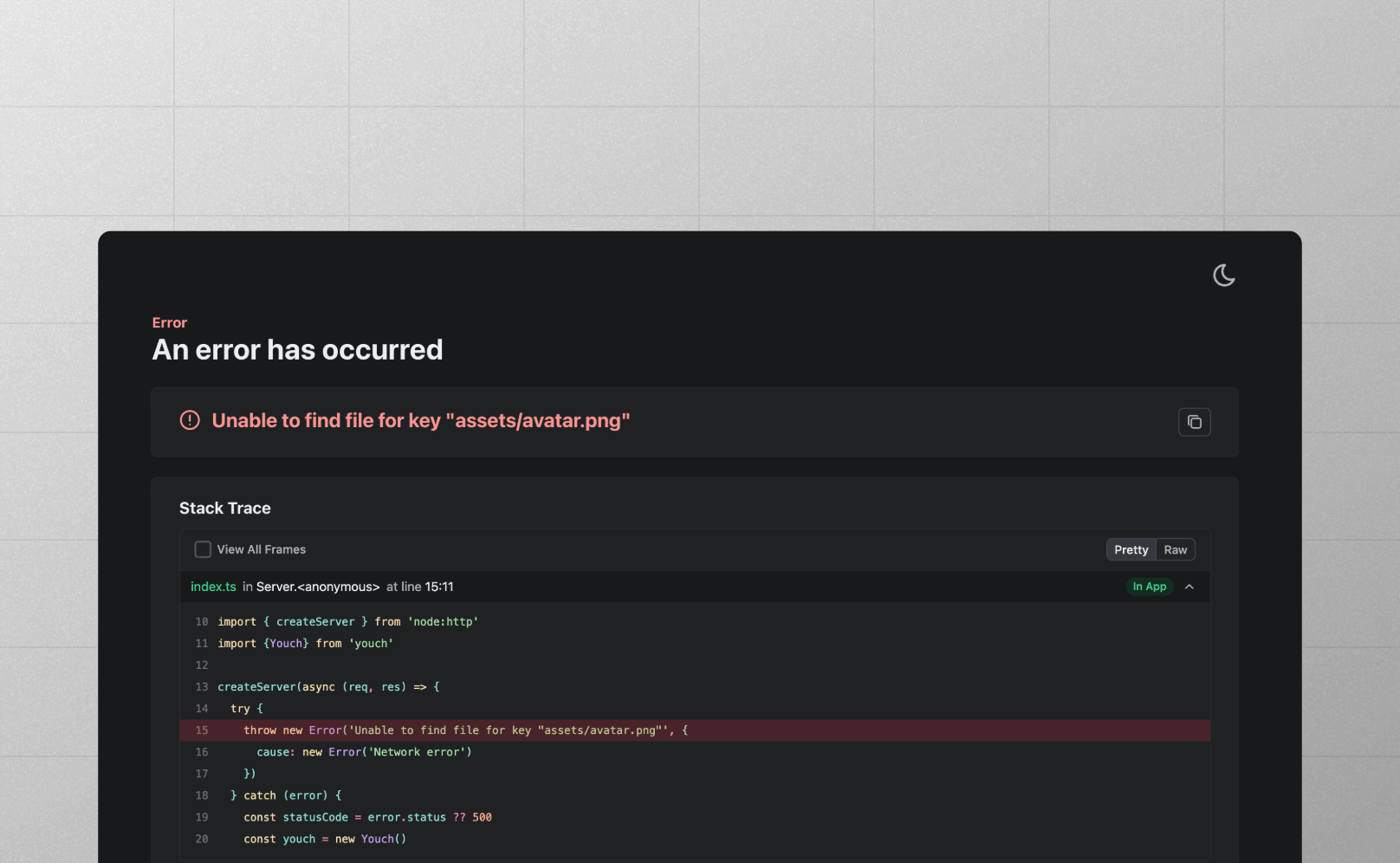 Last year, we rewrote Youch from the ground up—making it lighter (on-disk size dropped from 1.3 MB to 700 KB), adding support for error causes, ensuring proper compatibility with ESM modules, and giving it a refreshed UI design.